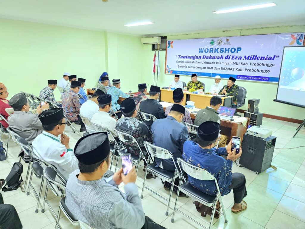 KRAKSAAN – Komisi Dakwah dan Ukhuwah Islamiyah Majelis Ulama Indonesia (MUI) Kabupaten Probolinggo bersama dengan Dewan Masjid Indonesia (DMI) dan Badan Amil Zakat Nasional (BAZNAS) Kabupaten Probolinggo sukses menyelenggarakan Workshop “Tantangan Dakwah di Era Milenial”. Acara yang digelar pada 8 Oktober 2025 di Kraksaan ini bertujuan merumuskan strategi dakwah yang efektif dan relevan bagi generasi muda.